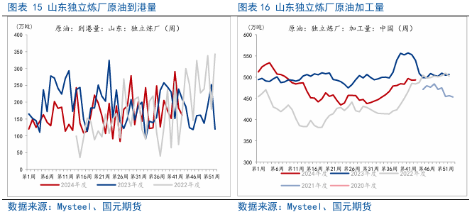 截至10月28日当周,山东独立炼厂原油到港量为161.5万吨,环比下跌21.2万吨,跌幅为11.60%。本期到港原油以中质原油为主,其中俄罗斯原油到港79.2万吨,且有1船新的稀释沥青到港。相较之下,去年同期,山东独立炼厂原油到港量为209.3万吨,环比下跌29.4万吨,跌幅为12.32%,到港原油以中质原油为主,其中俄罗斯原油到港54万吨,且有1船稀释沥青新到港。