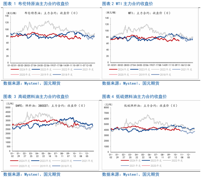 高低硫燃料油单边跟随原油运行为主。9月份阿联酋富查伊拉港的船用燃料油销量跌至低位,不仅比8月下降了6.3%,还较去年同期减少了2.2%。截至2024年10月25日,全球三大航运指数较9月显著回落,船用燃料油需求的淡季即将到来,进一步对燃油价格形成下行压力。
