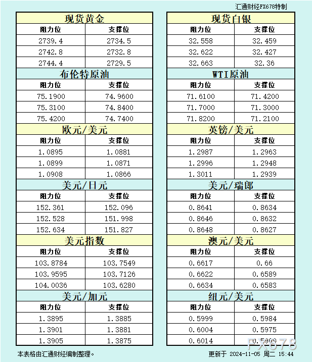 汇通财经APP讯——11月4日欧市黄金、白银、原油、美元指数、欧元、英镑、日元、瑞郎、澳元、加元、纽元支撑阻力位一览。