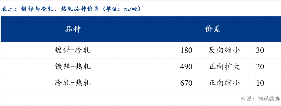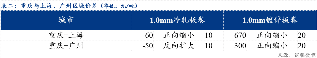 重庆、上海地区冷轧板卷区域价差缩小10元/吨;重庆、广州冷轧板卷区域价差反向扩大10元/吨。重庆、上海镀锌板卷区域价差缩小20元/吨;重庆、广州镀锌板卷区域价差缩小20元/吨。镀锌、冷轧品种价差反向缩小30元/吨;镀锌、热轧品种价差扩大20元/吨;冷轧、热轧品种价缩小10元/吨。
