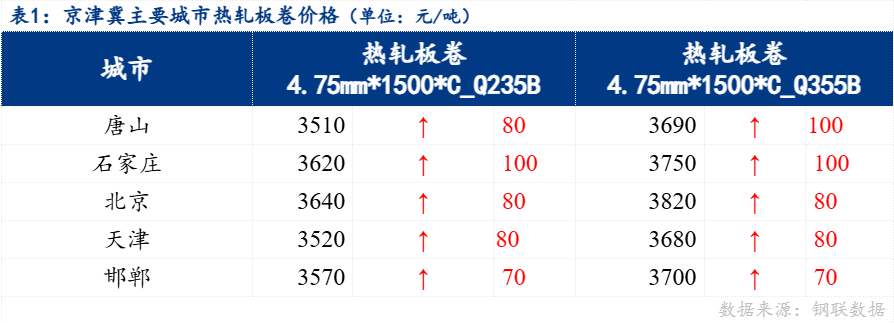 京津冀地区热轧板卷价格上涨,其中唐山较上一交易日上涨80元/吨 、北京较上一交易日上涨80元/吨 、石家庄较上一交易日上涨100元/吨 、天津较上一交易日上涨80元/吨 、邯郸较上一交易日上涨70元/吨 。