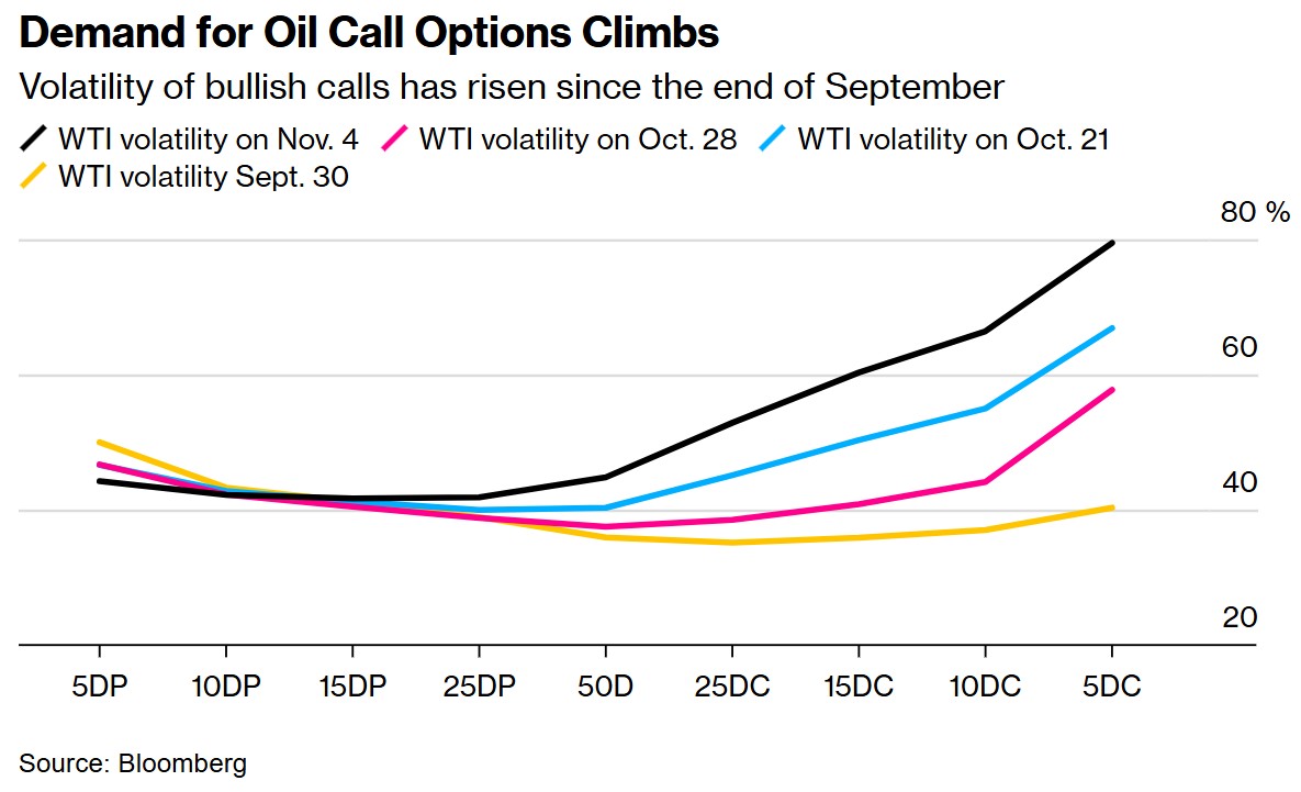 彭博社汇编的数据显示,周一晚间,价值超过1000万桶的美国原油12月看涨期权在90美元/100美元的价差交易中成交。这些合约将于11月15日到期,为交易员提供了一种相对便宜的方式(与期货合约相比)来防范未来几天的价格飙升。