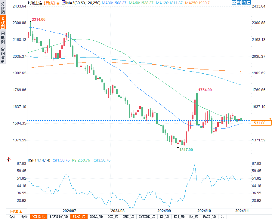 但需求端的疲软仍是影响价格的主要因素。目前玻璃行业的产量增长有限,对纯碱需求的提振效果不显著,尤其是北方需求进入淡季。预计未来纯碱期货价格将维持低位震荡,投资者可关注供需动态变化,特别是玻璃需求的恢复对纯碱的支撑效果。