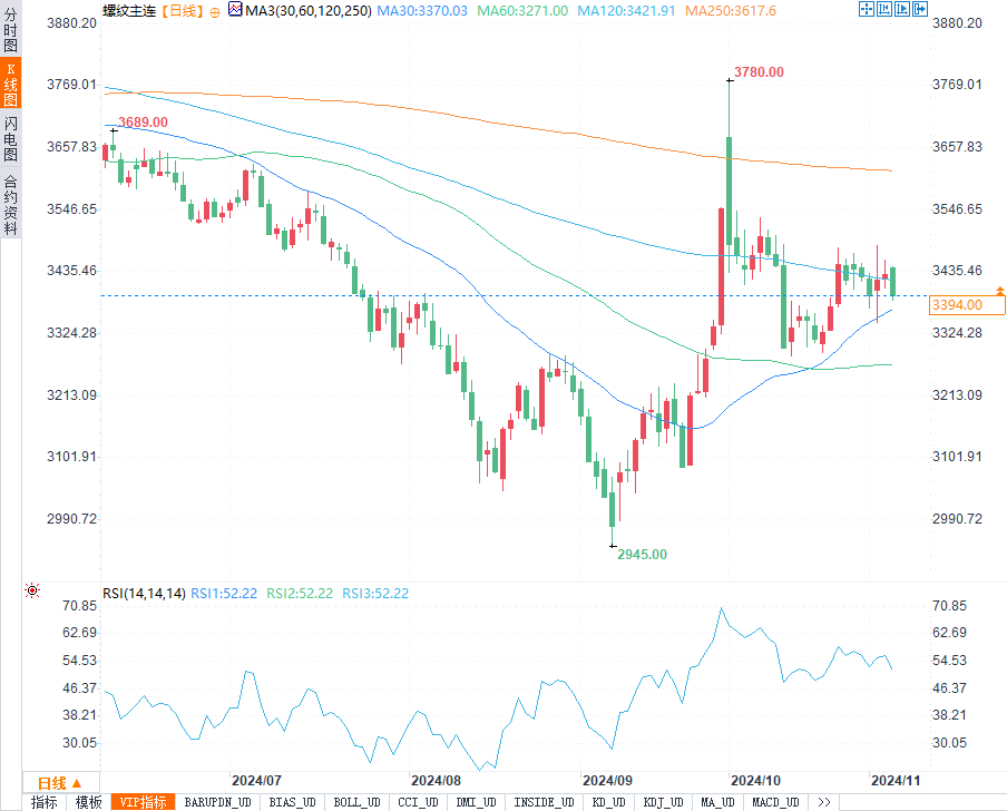在资金流动方面,螺纹钢主力合约本周资金流入显著减少,显示出市场观望情绪增强。中辉期货分析师指出,螺纹期价当前在3400元/吨附近震荡,且持续受制于20日均线压力。后市来看,市场情绪可能在大选结果落地后趋于稳定。