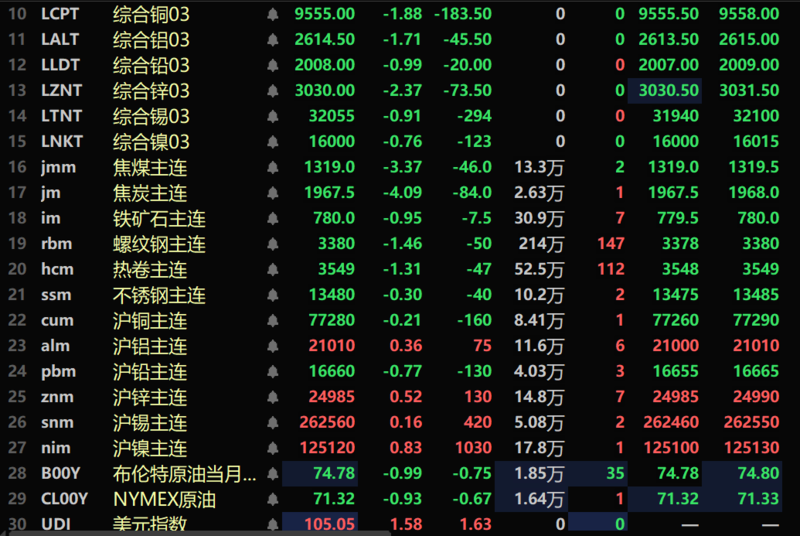 黑色系均飘绿,铁矿跌0.95%。螺纹、热卷均跌超1%。不锈钢跌0.3%。双焦方面,焦煤跌3.37%,焦炭跌4.09%。