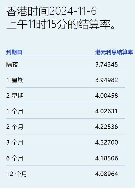 据香港银行公会11月6日消息,港元拆息并无大变动。其中,隔夜息微升3点至3.74345%,而与楼按相关的一个月拆息则连跌四天,报4.02631%,创六周新低。反映银行资金成本的三个月拆息同样四连跌,报4.227%,续见9月30日后最低,但六个月及一年拆息分别升至4.18506%和4.08964%。