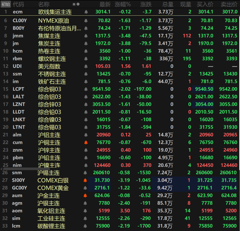 碳酸锂主连跌2.19%,工业硅主连跌2.26%。欧线集运主连跌0.12%。