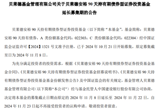 贝莱德安裕90天持有期债券延长募集期