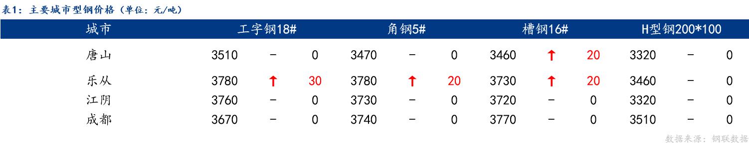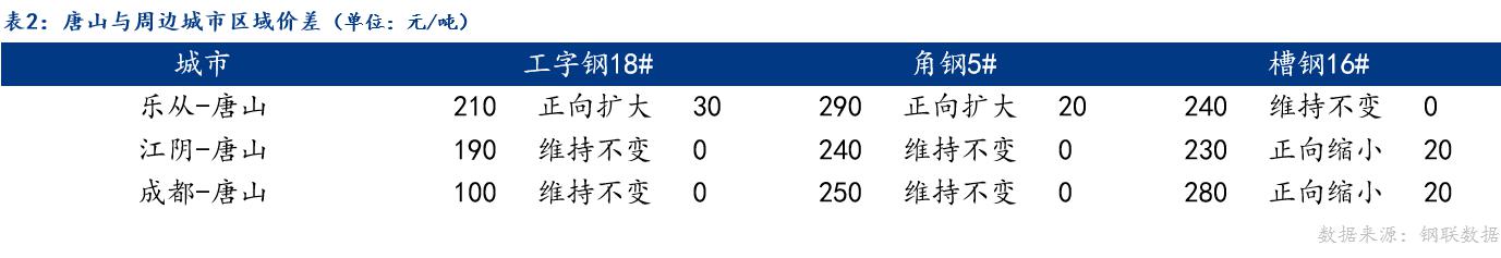 从区域价差来看,乐从工字钢、角钢与唐山工字钢、角钢价差正向扩大;江阴槽钢、成都槽钢与唐山槽钢价差正向缩小。