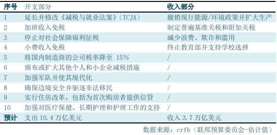 从目前执政结构来看,大概率将成为特朗普+共和党众议院及参议院的格局。这意味着共和党前期政策主张的落地预期将更加强势。回顾前期共和党主要政策主张,核心问题仍是扩大政府支出以改善社会及经济发展环境,同时在能源政策方面则偏向于以扩大传统能源产业来增加收入,同时对外征收关税。