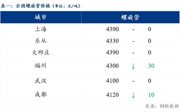 6日全国螺旋管主流城市价格下跌。今日热卷期货主力震荡下跌,主流市场原料带钢、热卷价格下浮下行,螺旋管少数市场价格跟跌。原料价格下跌,跌价行情下市场出货相对冷清。