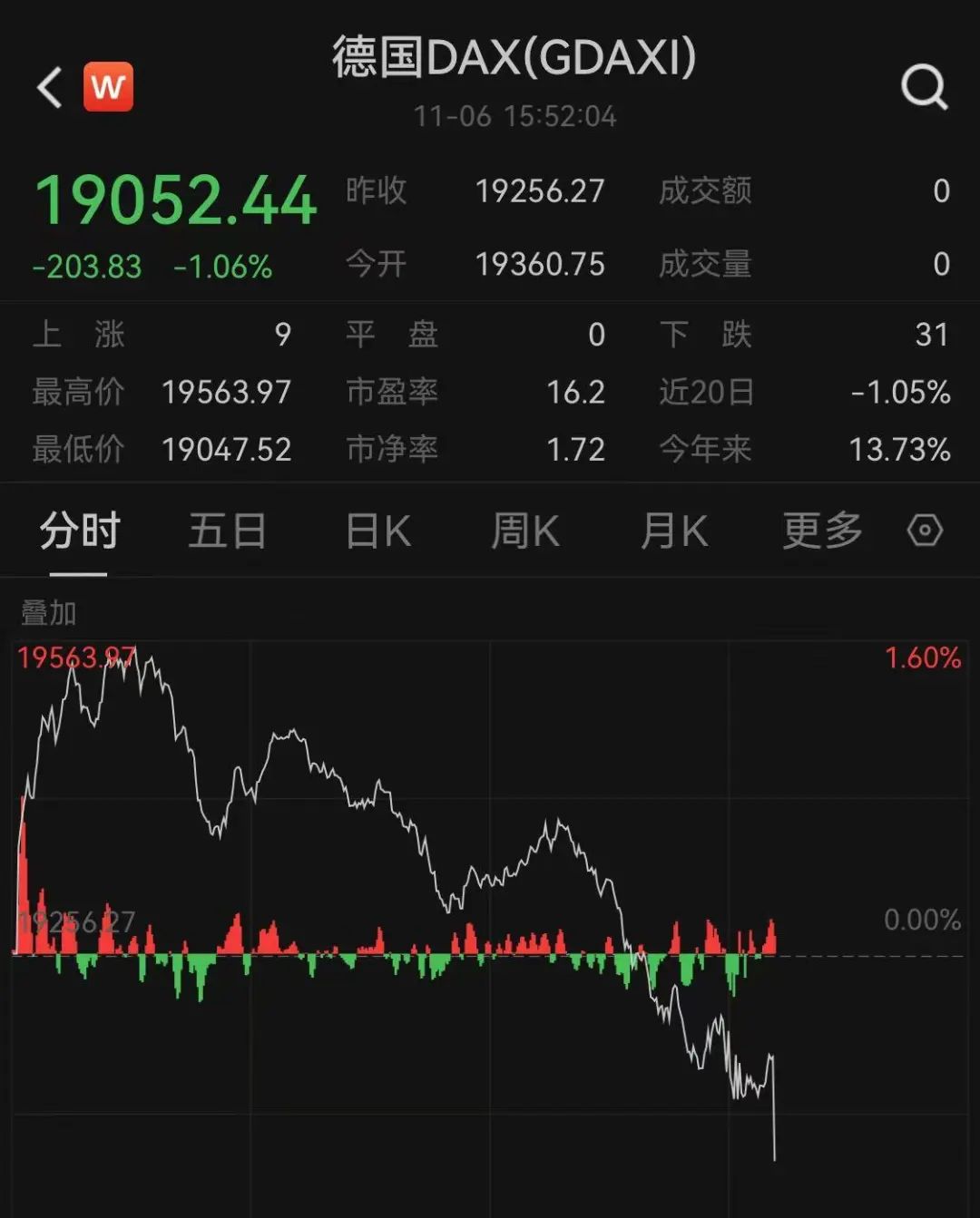 欧洲市场则出现全面跳水,其中英法德三国重要指数全部飘绿。