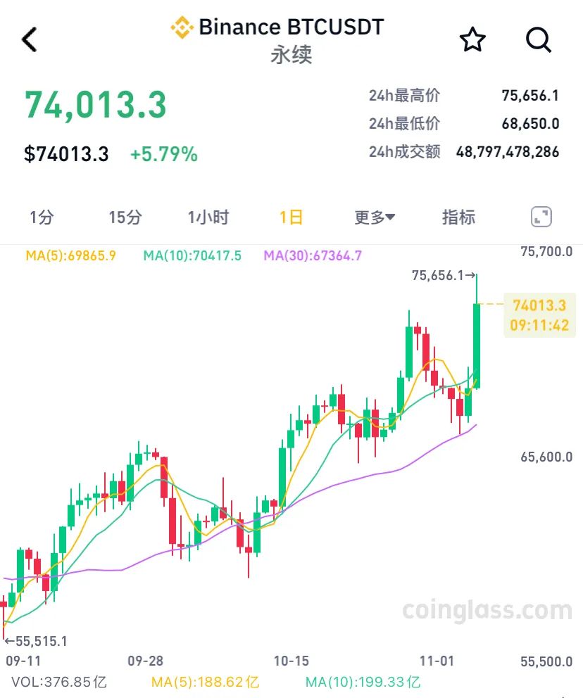 北京时间11月6日,虚拟货币市场大爆发。比特币此前盘中站上75000美元/枚,创下历史新高,截至记者发稿时,比特币价格回落至74000美元一线,日内涨幅收敛至6%左右。此外,狗狗币大涨10%。交易所运营商Coinbase大涨超15%,而MicroStrategy上涨超10%。