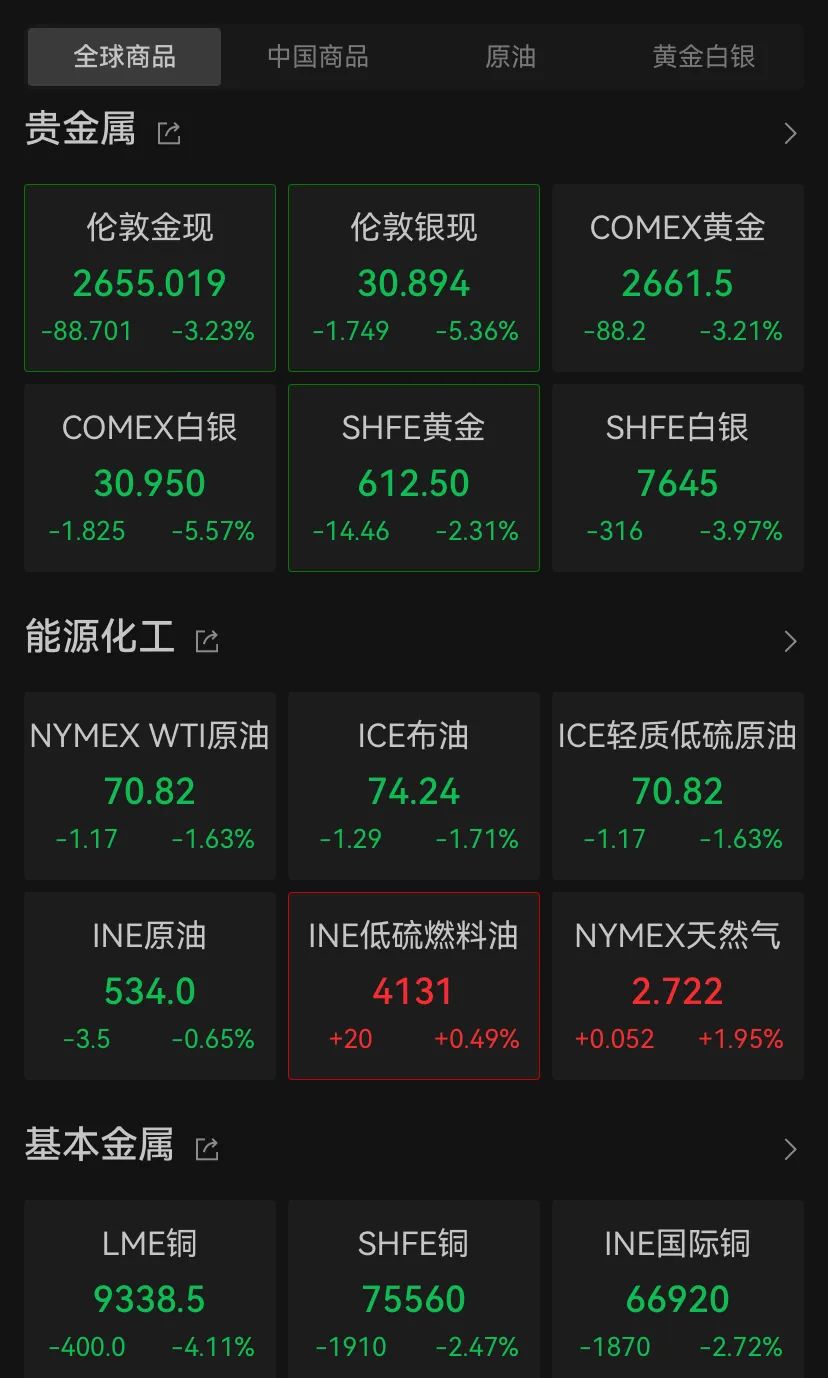 以美元计价的全球大宗商品普遍承压,金银铜油价格齐跌。截至记者发稿时,现货黄金跌破2700美元/盎司,日内跌幅超3%,创下自今年6月7日以来的最大跌幅;现货白银大跌超5%,报30.894美元/盎司。WTI原油、布伦特原油双双跌超1.5%;COMEX铜期货跌逾4.8%,报4.257美元/磅,LME期铜跌4%,报9348美元/吨。