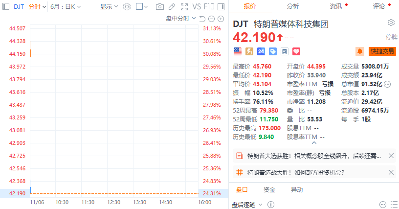 特朗普媒体科技集团盘初因波动性停牌,停牌前涨幅超24%,报42.19美元/股;特斯拉开盘大涨13%,股价创2023年7月以来新高。