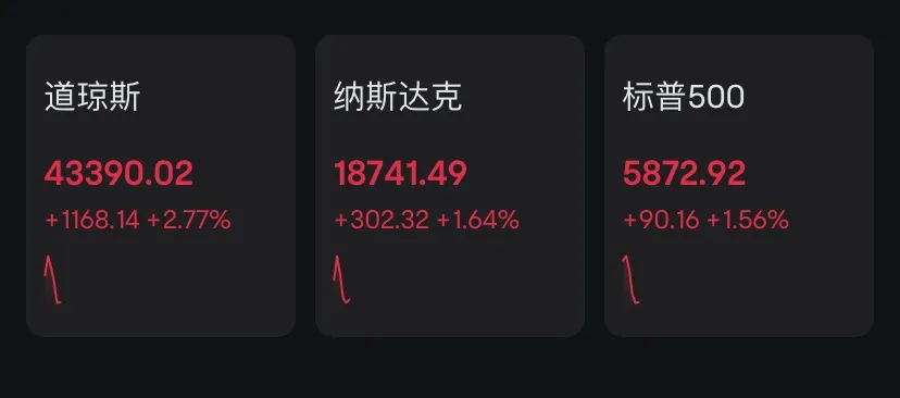 当地时间周三,美股大幅高开。截至记者发稿时,标普500指数涨1.56%,纳斯达克指数涨1.64%,道琼斯指数涨2.77%。