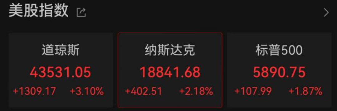 数据显示,截至北京时间23:15,道指涨超1300点,涨幅3.10%;标普500指数涨1.87%,纳指涨2.18%。特朗普媒体科技集团股价涨超24%。