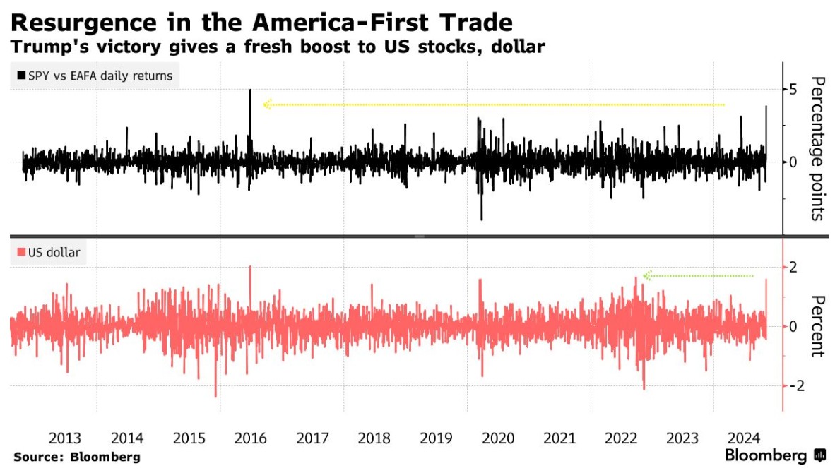 智通财经APP注意到,特朗普重返白宫为“美国优先”交易在周三获得了强大的推动力,因为市场押注下任总统将推出刺激国内增长并使世界最大经济体免受海外竞争的政策。