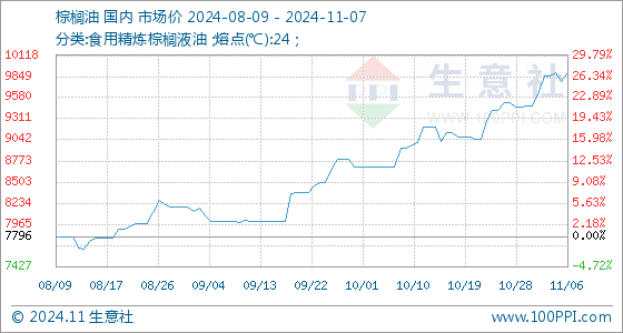 11月7日生意社棕榈油基准价为9894.00元/吨