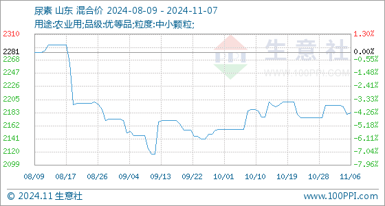 11月7日,生意社尿素基准价为2183.75元/吨,与本月初(2195.00元/吨)相比,下降了-0.51%。