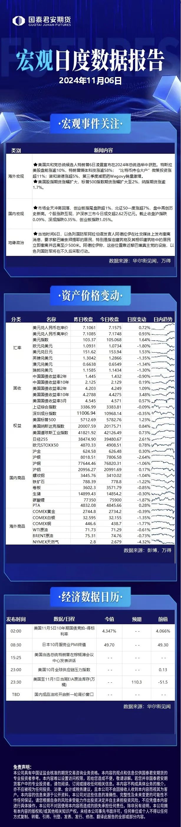 观点分享:昨日美国大选结果出炉,特朗普宣布胜选,同时国会选举中共和党赢得参议院,在众议院选举中共和党保持领先,或将形成横扫府院形势,有利于特朗普上台后政策的落地。从其此前提出的政见来看,对内减税有利于美国经济中短期进一步改善;对外增关税、限制非法移民或将推升美国通胀,整体上将支撑美股、美元走强,压制美债收益率回落空间。产业方面支持传统能源,鼓励制造业回流,放松金融监管,或不利于传统能源价格,利多虚拟货币等。对国内而言,贸易摩擦风险有所增加,不利于出口,亦增加人民币回落压力。但也将强化国内扩内需政策的对冲预期,包括本周人大会议、12月重磅会议及明年两会的政策预期升温。对期指而言,多空交织下预计市场博弈继续增大,但在当前政策驱动为主的市况下,下方受政策预期支撑明显。同时考虑到特朗普本身发言的不可预测性,后续期指波动回升也将更具确定性。