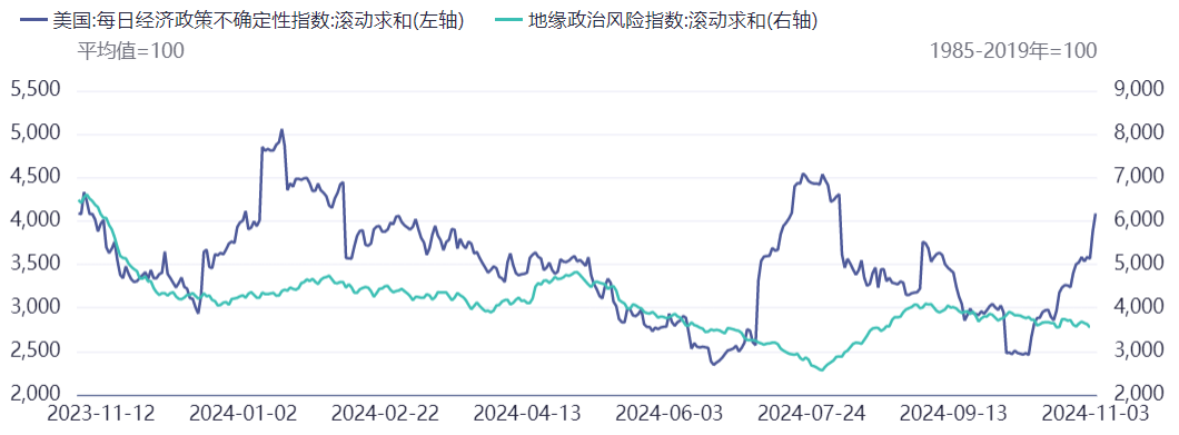 此外,避险情绪也是黄金上涨的原因之一。当下,俄乌冲突持续,中东局势不断升级,全球地缘政治不确定性上升。加上,美国总统大选选情胶着,美国政策不确定性上升。这些都会阶段性给黄金带来利好。