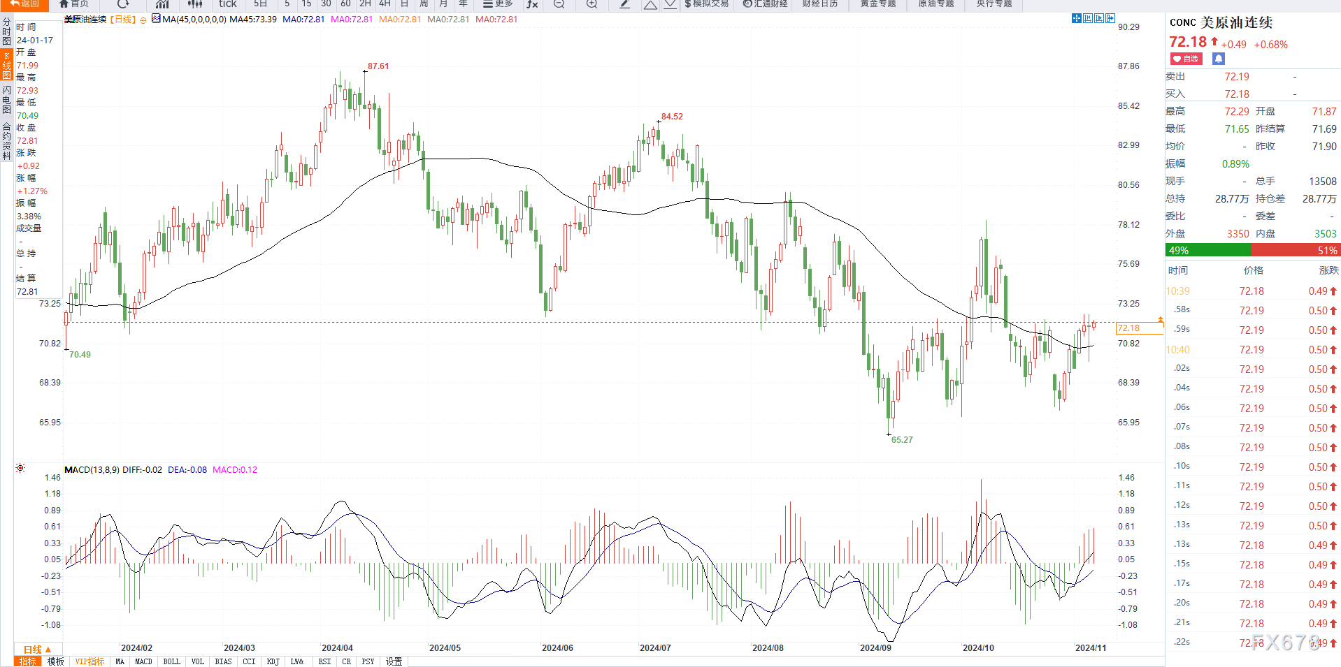 汇通财经APP讯——周四(11月7日)美原油亚盘时段小幅上涨,交投于72美元附近,再次回到箱体上沿。目前来看,美原油扛住了本轮对于强势美元的利空测试。同时在EIA库存增加的前提下,依然探底回升,说明大宗商品本轮有望进入多头区间,短期油价维持震荡上行。