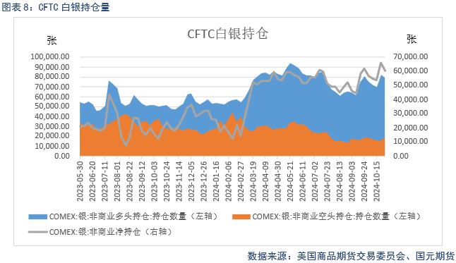 截止10月29日的周度统计周期中,黄金非商业多头持仓为366636张,较上周减少5177张,非商业空头持仓为87983张,较上周增加12374张,基金净持仓减少17551张,多头离场,空头进场,空头持仓变化更大。截止10月29日的周度统计周期中,白银非商业多头持仓为79649张,较上周减少2490张,非商业空头持仓为19218张,较上周增加3434张,基金净持仓减少5924张,多头离场,空头进场,空头持仓变化更大。