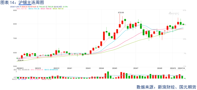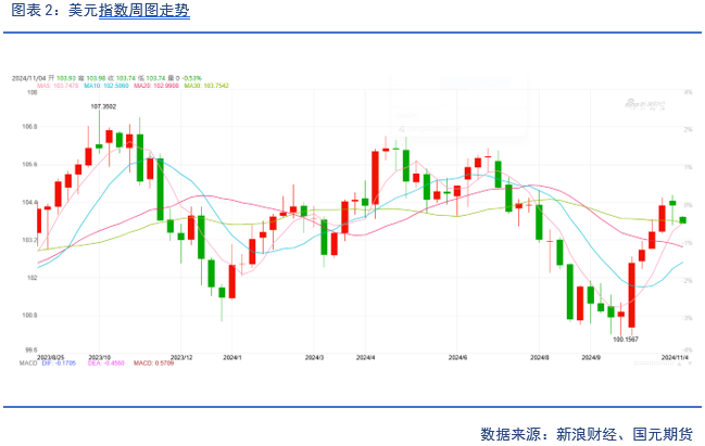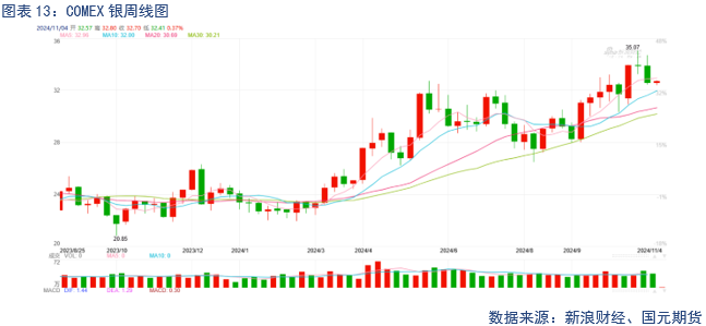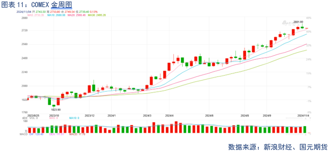上周美国经济数据呈现分化。9月JOLTS职位空缺显著低于预期,创三年新低,裁员人数增加,显示就业市场压力。尽管如此,10月ADP报告新增就业人数超预期至23.3万人,企业招聘加速。三季度实际GDP环比增长2.8%,核心PCE物价指数环比上涨2.2%,反映消费对经济的支持。与此同时,10月非农新增就业人数骤降至1.2万人,为2020年以来最低,失业率上升至4.14%。美元指数震荡维稳。本周需关注美国2024年总统大选、美国10月Markit服务业PMI终值、FOMC会议利率决议以及美国11月2日当周首次申请失业救济人数等。上周贵金属走势偏保守,本周将陆续公布美国大选结果以及11月利率决议,宏观不确定性大幅上涨,短期内贵金属或仍将偏强运行。