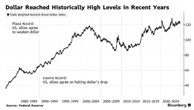 那么,当美元放飞自我般的涨势,愈发远离特朗普的汇率贬值期望时,特朗普是否能采取其他极端措施来干预遏制美元走高呢?例如,“强迫”其他经济体签订一份类似于《广场协议》的汇率条约?