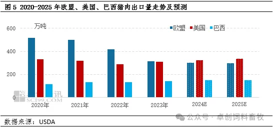 中国主要的猪肉进口来源国家及区域为欧盟、巴西和美国。2020-2023年中国及巴西产量增加,但与之相反的是,欧盟与美国猪肉产量下降,其中欧盟区域降幅尤为明显,这也是进口成本增加的主要原因。