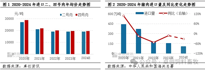 1.2020-2024年猪肉进口量及价格皆呈跌后企稳走势