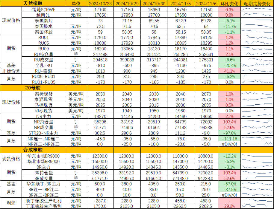 逻辑:【库存】截至2024年11月3日,中国天然橡胶社会库存111.3万吨,环比下降0.41万吨,降幅0.4%。中国深色胶社会总库存为62.4万吨,环比下降1%。其中NR库存降12%。中国浅色胶社会总库存为48.9万吨,环比增0.3%,其中RU库存小计降1%。深色胶去库主要来自于20号胶的仓单注销。在上期所9月的仓单预报里,预报了20号胶在10、11月有大量的仓单注销;同样,天然橡胶的仓单也会在11月集中注销。库存的去化不是当前橡胶交易的主要矛盾。