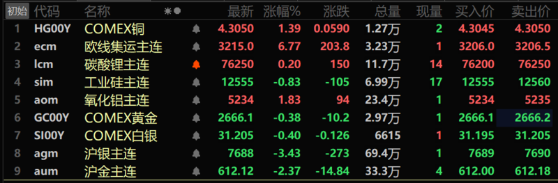 截至午间收盘,欧线集运主力合约涨6.77%,报3215点。