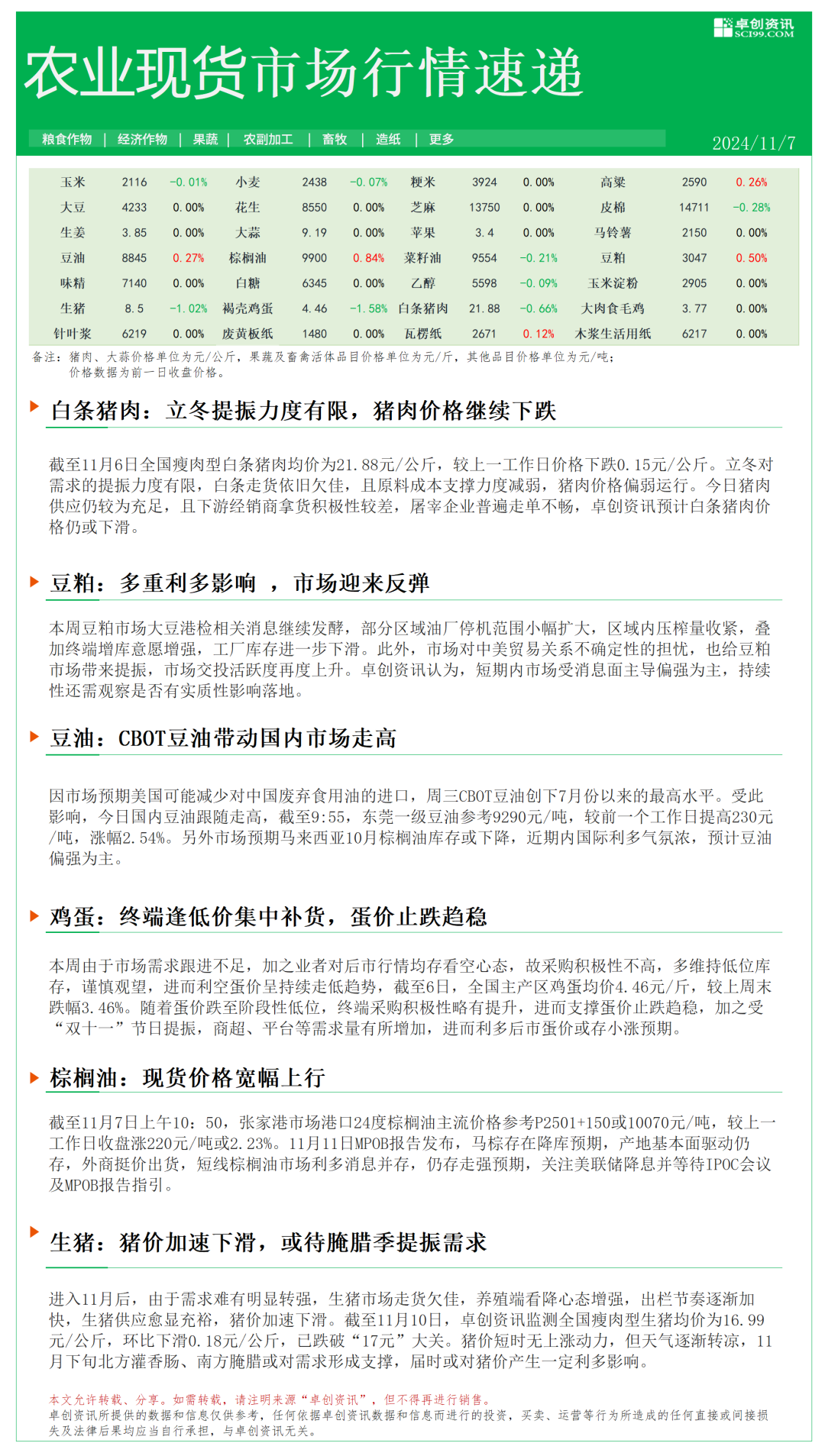 截至11月6日,卓创资讯监测数据显示,农业行业28个重点现货品种价格中,有5个上涨,8个下跌,15个稳定。其中,棕榈油价格涨幅最大,涨幅0.84%;鸡蛋价格跌幅最大,跌幅1.58%。