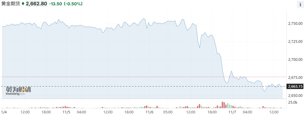智通财经获悉,在特朗普赢得美国大选后,黄金期货价格暴跌,与此同时,这一消息推动美债收益率、美元和美股强劲上涨。截至发稿,黄金期货跌至约2663美元/盎司的低点;自一周前黄金期货创下2805美元/盎司的历史新高以来,金价目前已下跌超过5%。