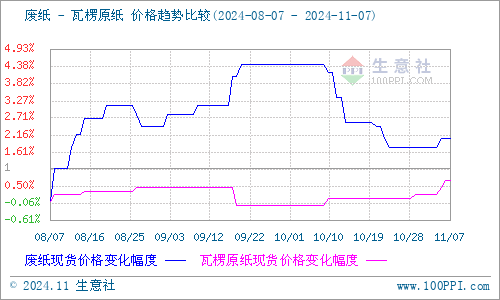 上游原料方面:本周浙江地区废纸价格稍有上调,国内纸厂废纸价格大多维稳,11月7日浙江地区废黄板纸A级收购价格均价为1507元/吨,与11月1日均价相比上涨了0.27%。近期打包站废黄板纸库存或加速释放,纸厂需求意向偏强,处于稳价采购废纸的状态。加之下游市场涨价函频发,对废纸市场起到利好作用,因此废纸价格稍有上探。