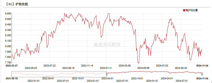 上周沪伦比值在沪铝价格大幅上涨以及伦铝价格小幅回升后,由由7.92升至7.955。