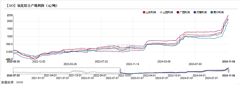 利润层面,由于氧化铝价格持续上涨,各产地氧化铝利润均处于高位,其中山东地区氧化铝利润为2148元/吨,较前一周增加177元,山西地区利润为2357元/吨,广西地区为2380元/吨,贵州地区利润回升至1951元/吨。