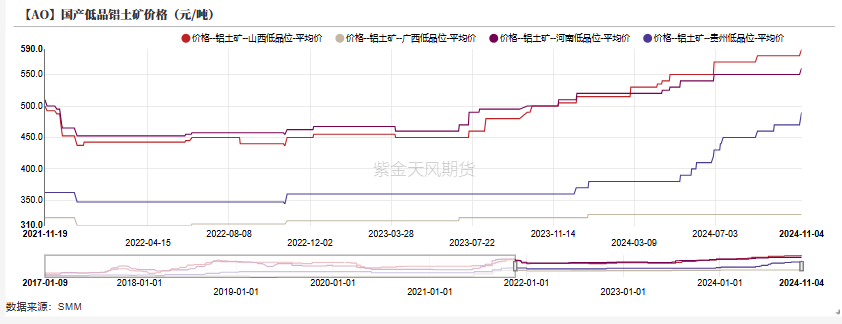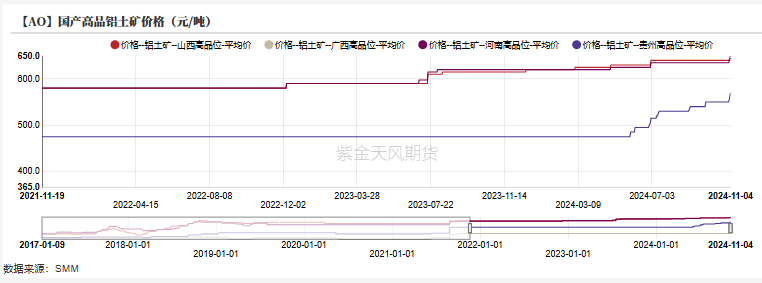 国产铝土矿层面,目前河南、山西地区国产铝土矿仍处于偏紧的态势并处于高位运行,低品矿方面,河南地区低品矿石为560元/吨,较上周上涨10元/吨,山西地区低品矿石为590元/吨,较上周上涨10元;高品矿方面河南价格为645元/吨,山西地区价格为650元/吨。