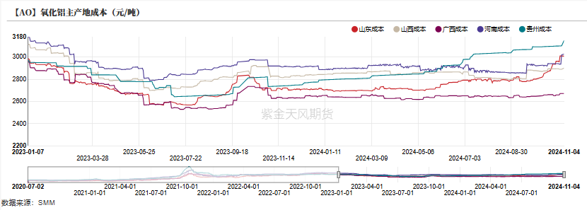 氧化铝成本层面,液碱价格上涨,山东地区氧化铝成本上行至2961元/吨,其余地区大致稳定。