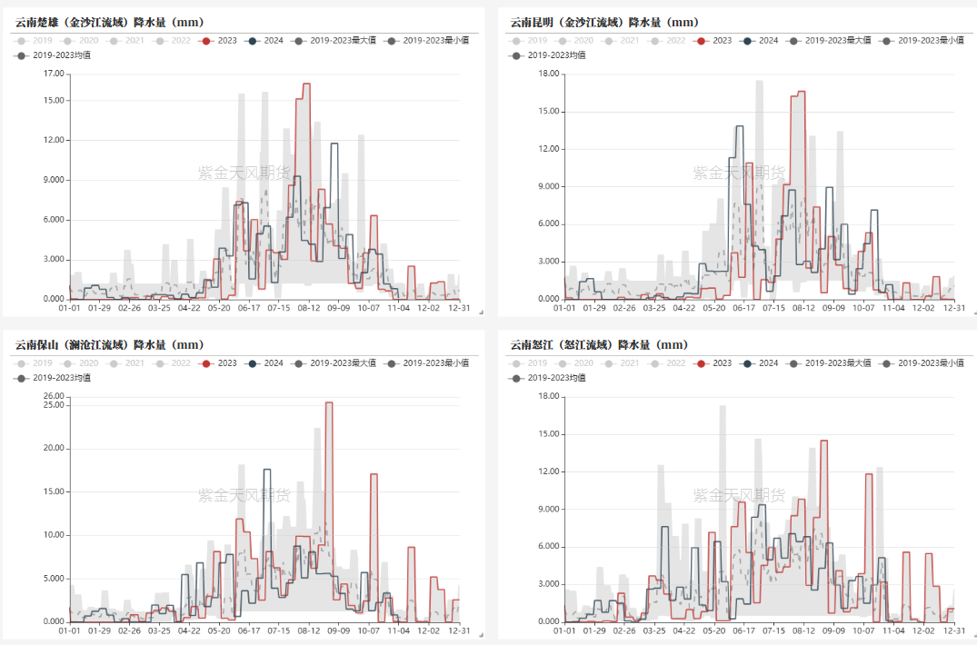 目前云南地区逐步进入旱季,金沙江、澜沧江流域降水逐步开始减少,但受益于前期丰沛的降水,当地储水较为充足;