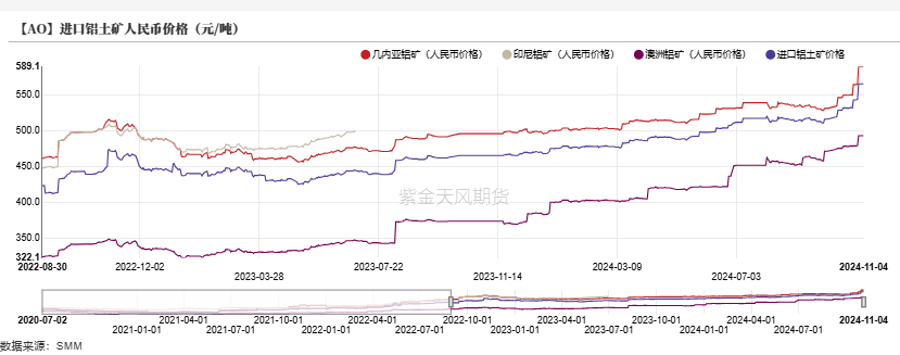 进口铝土矿方面,几内亚进口矿石价格有所上涨,澳大利亚地区矿石价格保持稳定,几内亚矿石价格为82.5美元/吨,澳大利亚矿石为69美元/吨,均较上周有所上涨。