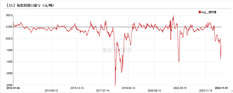 氧化铝进口盈亏:偏多 上周氧化铝进口盈利为-689元/吨,进口窗口关闭。