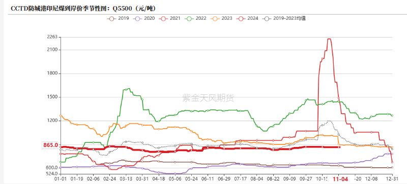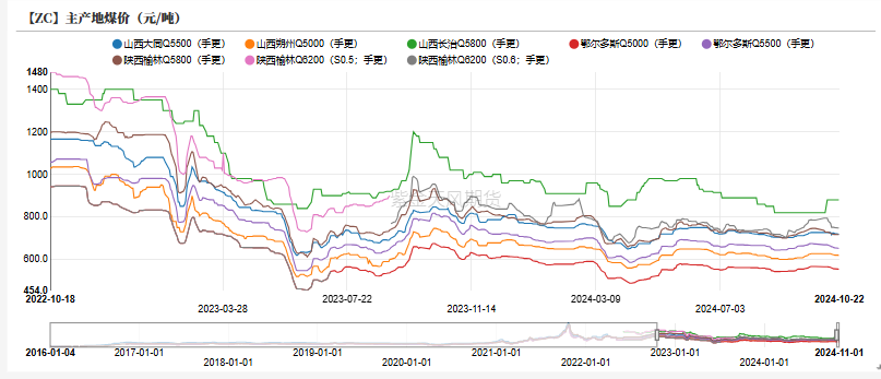 动力煤价格方面,上周动力煤价格波动较小,防城港印尼煤价为865元/吨,与前一周相比回落20元/吨,陕西榆林Q5800涨至721元/吨,鄂尔多斯Q5500为659元/吨,与前一周下跌2元/吨。