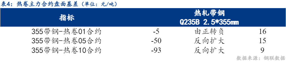 7日市场热卷01合约与355带钢价差由正转负16元/吨,热卷05合约与355带钢价差反向扩大15元/吨。