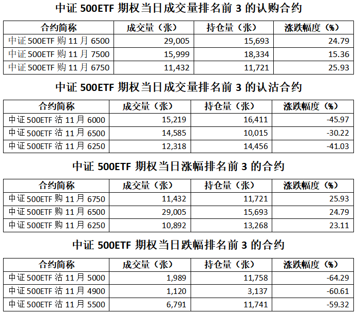 中证500ETF期权总成交面额123.52亿元,减少26.08%,期现成交比为0.03,权利金成交额2.70亿元;期权总成交量194,216张,减少26.11%,其中认购期权成交量106,035张,认沽期权成交量88,181张,认沽认购成交比率为0.83(上一交易日认沽认购成交比率为0.84)。