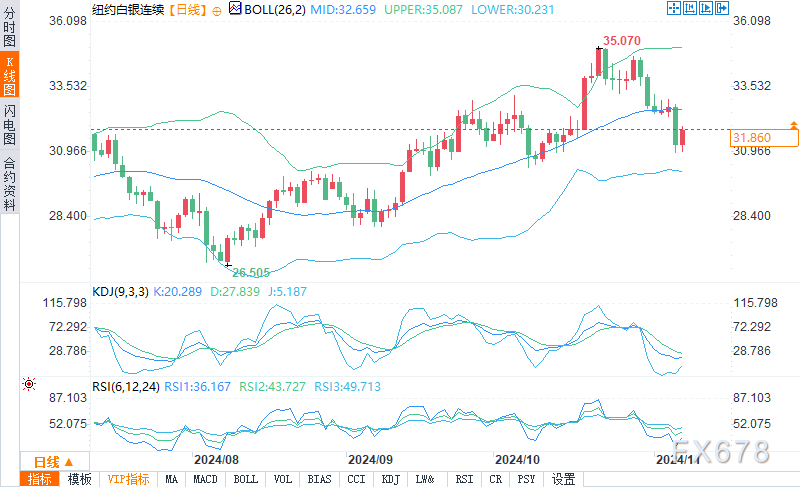COMEX12月白银期货多头近期仍有整体技术优势,但已严重消退。K线图上三个月的上升趋势岌岌可危。白银多头的下一个上行目标是收于坚实的技术阻力位33.50美元上方。空头的下一个下行价格目标是收于坚实支撑位30美元以下。第一个阻力位见于32.00美元,然后是32.50美元。下一个支撑位见于本周低点30.94美元,然后是10月低点30.345美元。