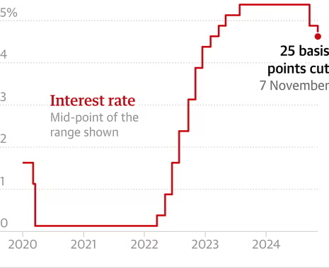 北京时间11月8日,美联储在联邦公开市场委员会(FOMC)议息会议上宣布,将联邦基金利率目标区间下调25个基点,至4.5%-4.75%之间。这是美联储年内第二次降息,也是自2020年3月份以来的第二次降息,标志着美国货币政策正式进入宽松周期。