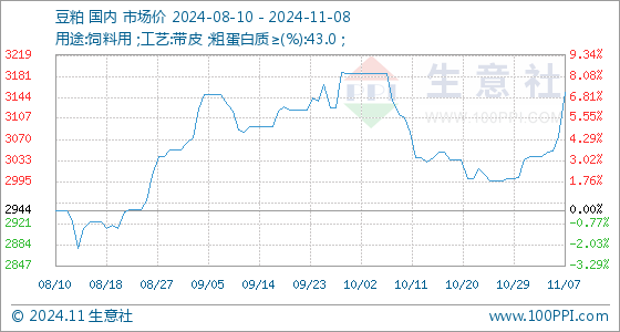 11月8日,生意社豆粕基准价为3154.00元/吨,与本月初(3034.00元/吨)相比,上涨了3.96%。